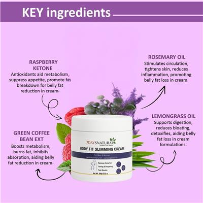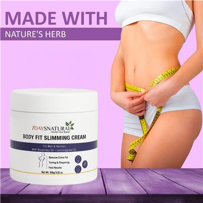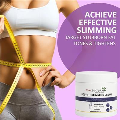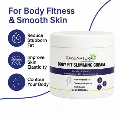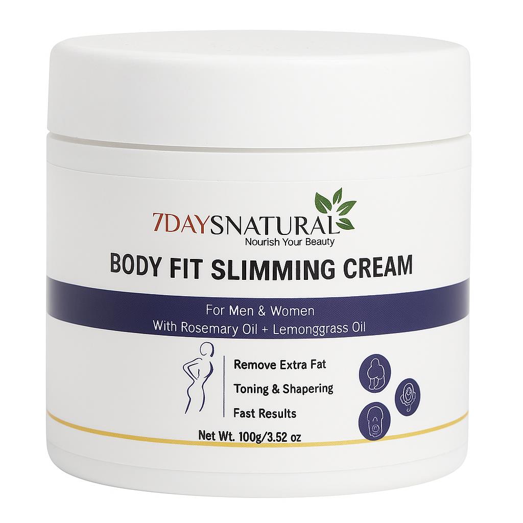 Remove Extra Fat | Toning & Shaping | Fast Results | For Men & Women Discover the power of nature with BODY-FIT Slimming Cream by 7 Days Natural. Infused with herbal extracts, this fast-absorbing cream helps reduce stubborn fat on the belly, thighs, arms, and waistline while toning, shaping, and smoothing the skin. Its lightweight, non-sticky formula makes daily massage effortless, delivering visible results for both men and women on their fitness journey. ✅ Raspberry Ketone Power – Antioxidants boost metabolism, suppress appetite & promote fat breakdown for effective belly fat reduction. ✅ Green Coffee Extract – Enhances metabolism, burns fat & blocks absorption to support slim, toned results. ✅ Rosemary Oil Boost – Stimulates circulation, tightens skin & reduces inflammation while promoting fat loss. ✅ Lemongrass Oil Detox – Supports digestion, reduces bloating & helps flush out toxins for a lighter, more sculpted body. ✅ Targeted Fat Reduction – Helps minimize excess fat on stomach, thighs, arms & waistline. ✅ Firming & Shaping – Improves skin elasticity & tone, reducing the look of cellulite. ✅ Quick Absorption – Lightweight, non-greasy texture absorbs smoothly, leaving skin refreshed. ✅ Unisex Herbal Formula – Safe, natural & effective for both men and women. ✅ Visible Results in Days – Best used with regular massage for fast, noticeable transformation. How to Use: 1. Clean the Area – Wash and dry the target area (stomach, thighs, arms, or waist) before application. 2. Apply a Small Amount – Squeeze out a thin layer of cream onto your palm. 3. Massage Gently – Rub the cream in circular motions for 10–15 minutes until fully absorbed. 4. Use Consistently – Apply 1–2 times daily (morning & evening) for best results. 5. Enhance with Activity – Combine with light exercise, healthy diet, or a warm compress to maximize effectiveness.