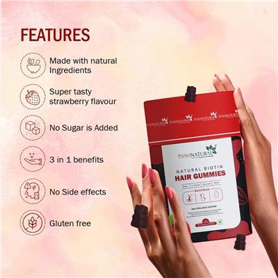 šæ Biotin Hair Gummies | 60 Days Pack | Stronger, Shinier Hair & Nails Boost your hair and nail health with 7Days Biotin Hair Gummies ā a sugar-free, delicious Strawberry-flavored daily supplement enriched with Biotin, Zinc, Folic Acid, Fiber & Multivitamins. Designed to nourish from within, these gummies strengthen hair, improve shine, and keep nails resilient. ā Stronger Hair ā Supports scalp health & boosts keratin production. ā Shinier Hair ā Promotes healthier hair growth for vibrant shine. ā Healthy Nails ā Zinc & vitamins reduce brittleness and improve strength. ā Scalp Nourishment ā Selenium combats hair thinning and promotes growth. ā Follicle Regeneration ā Helps stimulate hair follicle renewal. ā Daily Beauty Support ā Supports hair strength and overall hair & nail vitality. ā Sugar-Free & Delicious ā Strawberry-flavoured gummies for guilt-free beauty care. š How to Use: 1ļøā£ Take ā 2 gummies daily, preferably with a meal. 2ļøā£ Consistency ā Use daily for visible results. 3ļøā£ Enjoy ā Great taste makes beauty care easy and enjoyable. ā ļø Tip: Combine with a balanced diet for the best results in hair and nail health.