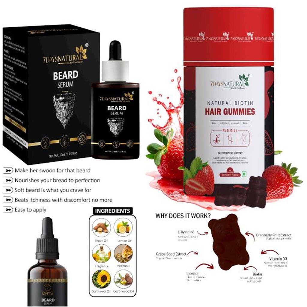 It's time to take control! 7 Days Natural brings you the ultimate Power Combo for comprehensive hair health, from your scalp to your chin. 7 Days Natural Biotin Hair Gummies (Strawberry Flavor with no sugar an all natural ingredients ): Stop Hair Fall: Fortified with Biotin and essential vitamins, these delicious gummies nourish your hair follicles from within, significantly reducing hair fall and promoting stronger strands. Boost Hair Growth: Experience accelerated and healthier hair growth, bringing back density and vibrancy to your mane. 7 Days Natural Beard Serum: Grow a Fuller, Thicker Beard: Our expertly crafted serum, enriched with Argan Oil, Vitamin E, and Cedarwood Oil, stimulates facial hair growth, fills in patchy areas, and helps you achieve the beard of your dreams. Nourish & Conquer Itchiness: Say goodbye to dry, itchy skin and a brittle beard. This serum deeply nourishes, softens, and promotes a healthy, luxurious beard you'll love to touch.