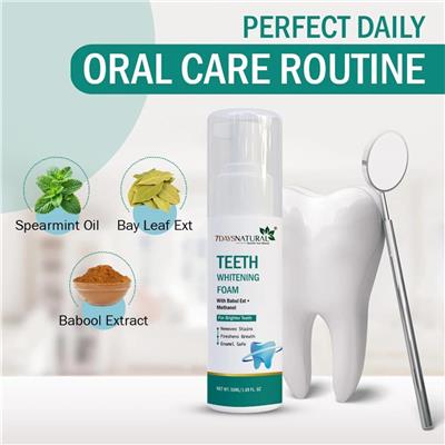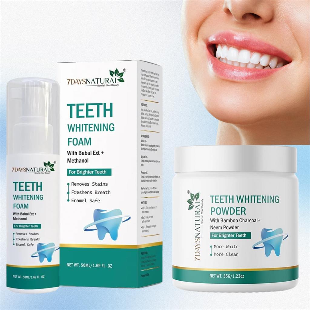 𦷠Go Natural Teeth Care Combo Kit ā For a Brighter, Healthier Smile ⨠Product Highlights: Complete Dental Care Duo: Includes 7DaysNatural Teeth Whitening Powder and 7DaysNatural Teeth Whitening Foam for total oral care. Whiter Teeth, Naturally: Removes stubborn stains caused by coffee, tea, and tobacco for visibly brighter teeth. Deep Clean + Fresh Breath: Foam works as both a whitening treatment and mouthwash, eliminating bacteria and odor for long-lasting freshness. Natural Ingredients: Enriched with bamboo charcoal, neem, and babul extract ā known for their cleansing, antibacterial, and whitening properties. Gentle on Enamel: Effectively whitens without harsh chemicals or sensitivity. Holistic Oral Hygiene: Cleans, whitens, and refreshes your entire mouth for all-around confidence. Safe & Eco-Friendly Choice: 100% natural formula ā no artificial colors, parabens, or fluoride. Versatile Use: Powder for deep stain removal; foam for daily freshness and protection. Perfect for Daily Use: Maintains oral health while keeping your breath fresh all day long. šæ Go Natural. Get Confident. Smile Brighter ā with 7DaysNatural.