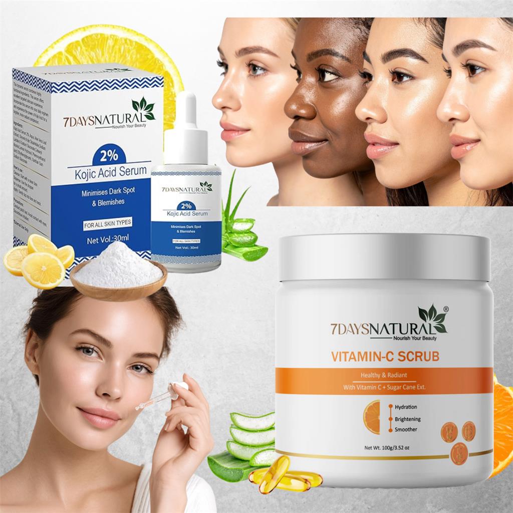 Go Natural Fairness Face Pack Combo by 7Days Natural Reveal your inner radiance — naturally! Combo Includes: 7Days Natural 2% Kojic Acid Serum 7Days Natural Vitamin-C Scrub ✨ Key Benefits Reduces Dark Spots & Uneven Skin Tone: Kojic Acid Serum targets hyperpigmentation and blemishes by inhibiting excess melanin production. Brightens & Clarifies Skin: Vitamin C and sugar cane extract help reveal a fresher, more radiant complexion. Gentle Exfoliation: The Vitamin-C Scrub removes dead skin cells and impurities without harshness. Smooths Skin Texture: Promotes soft, even, and youthful-looking skin. Fights Tanning & Signs of Aging: Natural antioxidants help combat dullness and restore a healthy glow. Lightweight & Fast-Absorbing Serum: Deeply nourishes and improves clarity with consistent use. Visible Results in Weeks: Thousands have experienced noticeable improvement in just a few weeks. 🌸 Why Choose 7Days Natural Formulated with Kojic Acid + Vitamin C synergy for maximum effectiveness. Natural, Paraben-Free, and Sulfate-Free — gentle enough for all skin types. Cruelty-Free & Dermatologically Tested for safe daily use.