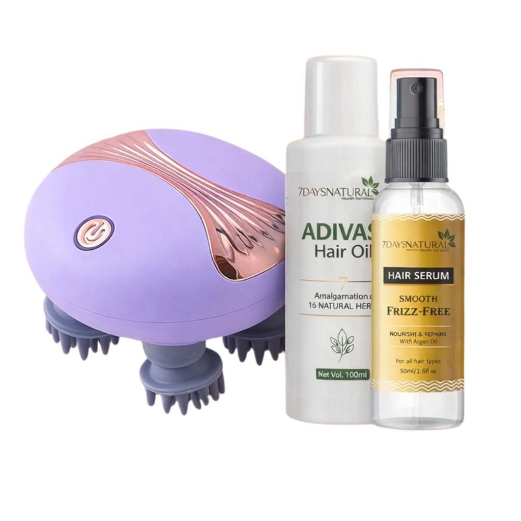 ✨ Complete 3-step hair care system combining infrared therapy, Ayurvedic nourishment, and frizz control for total hair transformation ✨ 360° Infrared Hair Growth Massager with 4 speed settings stimulates blood circulation, awakens dormant roots, enhances oil absorption, and relieves tension, headaches & scalp stress ✨ Smart 15-minute auto shut-off with waterproof, detachable silicone heads for hygienic shower use with oils or shampoo ✨ 7DaysNatural Hair Regrowth Oil infused with Nagkesar, Majith, Brahmi, Tulsi & Baheda to reduce hair fall, fight dandruff, strengthen follicles, and promote visible growth in as little as 8 days ✨ 100% Ayurvedic, chemical-free, vegan & cruelty-free formula suitable for all hair types ✨ Frizz Control Serum powered by JD Jojoba Hair Complex + 6 rare flower oils to smooth cuticles, tame frizz, prevent split ends & add long-lasting shine ✨ Protects against humidity, pollution & heat while keeping hair lightweight and manageable ✨ Supports thicker, longer, healthier, and shinier hair naturally ✨ Perfect for dry, thinning, frizzy, or damaged hair