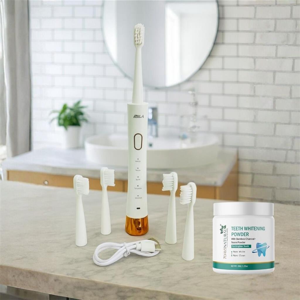 + FREE Floss | 40,000 Sonic Vibrations/Min | 5 Brushing Modes | 5 Brush Heads + Protective Cap | 25-Day Rechargeable Battery | IPX7 Waterproof Reinvent your smile with 40,000 sonic vibrations per minute, 5 intelligent modes, and 5 premium brush heads. Waterproof, travel-ready, and designed for dentist-level deep cleaning — all in one smart kit with FREE floss included. ✅Powerful Sonic Cleaning – 40,000 vibrations per minute remove plaque, stains, and buildup far more effectively than a manual brush. ✅5 Intelligent Brushing Modes – Designed for every need: - Clean – Daily deep cleaning for healthier teeth and gums. - Polish – Smoothens enamel and restores natural shine. - White – Tackles tough stains for a visibly brighter smile. - Massage – Gentle pulsations to boost gum circulation and strength. - Milder – Soft, soothing care for sensitive teeth or new users. ✅Complete Kit with Attachments – Comes with 5 premium brush heads to last you months of consistent use, plus a protective cap for hygienic storage. ✅Travel-Friendly Power – A single USB charge lasts up to 25 days, making it perfect for travel and busy lifestyles. ✅Smart Brushing Timer – 2-minute auto shut-off with 30-second reminders ensures dentist-recommended brushing every time. ✅IPX7 Waterproof – Safe for use in the shower with no worries. ✅Ergonomic Grip – Lightweight, non-slip handle for easy control at any age. ++ FREE Teeth Cleaning Powder Smarter. Cleaner. Whiter. The toothbrush that works as hard as you smile.